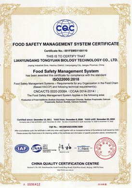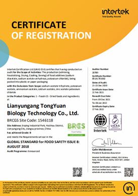 企業(yè)質(zhì)量方針科學(xué)化,精細(xì)化的管理 ----------追求出色品質(zhì)企業(yè)建立了完善的質(zhì)量確保體系,實(shí)施ISO22000-9000質(zhì)量管理,配備了經(jīng)過專業(yè)培訓(xùn)和考核的質(zhì)量人員和完整的分析儀器,對從原材料供應(yīng)、產(chǎn)品生產(chǎn)、包裝、儲藏到運(yùn)輸?shù)娜^程實(shí)施監(jiān)督管理,并制定了一系列質(zhì)量標(biāo)準(zhǔn)管理程序(SMP),標(biāo)準(zhǔn)操作程序(SOP)和標(biāo)準(zhǔn)質(zhì)量指標(biāo)(STP)以確保產(chǎn)品的品質(zhì)。 我們所持有的證書經(jīng)過多年的發(fā)展。連云港通源化工有限公司至今已有的證書具體如下:衛(wèi)生食品許可證/Kosher/Halal/ISO22000-9000